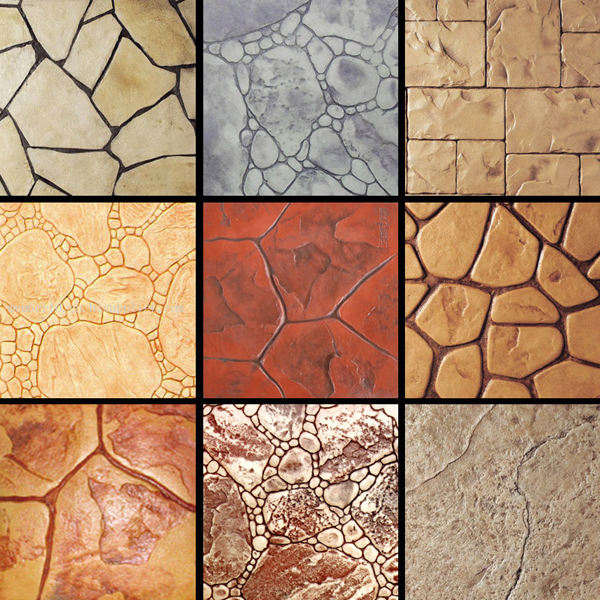 5、使用藝術地坪模具對地坪麵層進行紋理處理。藝術地坪模具應配套使用,首先確定好紋理的分布方向,選好第一塊模具放置的位置和角度,然後其它的模具依次緊貼第一塊模具放置。彩色混凝土藝術地坪壓模采用人工壓模,壓模應由技術較好的人員進行作業以保證壓紋深度一致和模具放置的準確性。